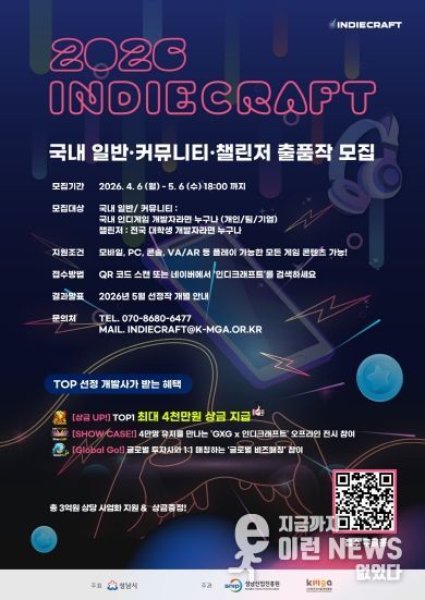 이런뉴스(e-runnews) 김삼성 기자 | 성남산업진흥원과 한국모바일게임협회가 'K-인디게임'을 발굴하고 글로벌 진출을 지원하는 '2026 인디크래프트' 참가 개발사 모집을 시작한다.