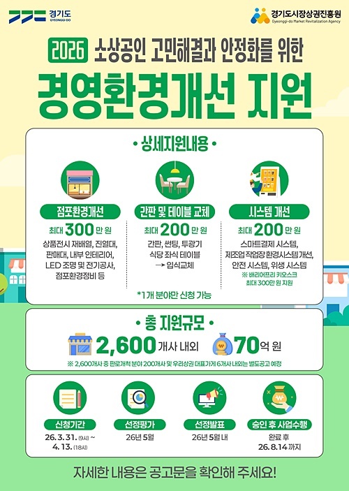 경기도와 경기도시장상권진흥원(이하 경상원)이 추진 중인 ‘2026년 소상공인 경영환경개선사업’이 높은 참여 속에 마감 시점을 향해 가고 있다. 지난 3월 31일 접수를 시작한 이후 신청이 꾸준히 이어지는 가운데, 접수는 오는 4월 13일까지 진행된다.