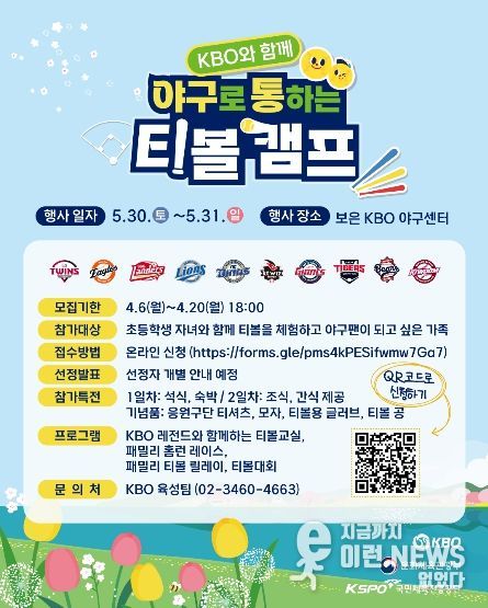 이런뉴스(e-runnews) 김삼성 기자 | KBO는 ‘2026년 야구로 통하는 티볼캠프’에 참가할 가족을 오늘(4월 6일)부터 20일(월) 오후 6시까지 모집한다.