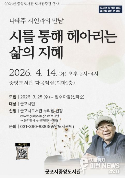 이런뉴스(e-runnews) 김삼성 기자 | 군포시중앙도서관은 제62회 도서관주간을 맞아 시민들이 시를 통해 삶의 여유와 위로를 느낄 수 있도록 나태주 시인과 함께하는 특별 프로그램을 운영한다.