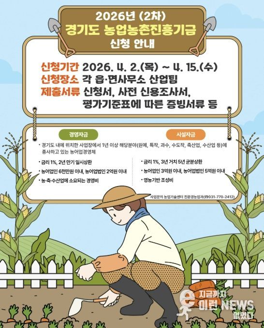 이런뉴스(e-runnews) 김삼성 기자 | 양평군은 농어업인의 소득 향상과 삶의 질 개선, 경영 안정을 도모하고 농업 경쟁력 강화를 위해 ‘2026년 경기도 농업농촌진흥기금 경영 및 시설자금 지원’ 2차 대상자를 모집한다고 밝혔다.