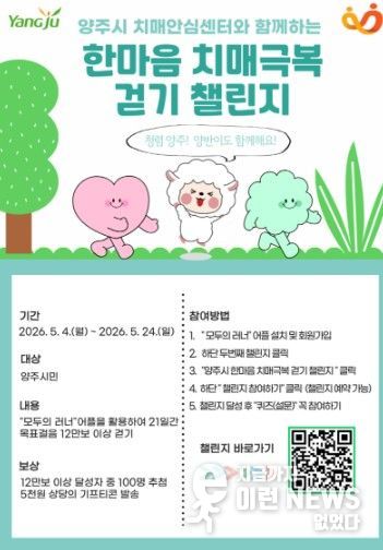 이번 행사는 비대면 방식으로 진행되며, 모바일 앱 ‘모두의 러너’를 통해 참여할 수 있다. 앱 내 ‘챌린지’ 탭에서 ‘양주시 한마음 치매극복 걷기 챌린지’를 선택한 뒤 참여 버튼을 누르면 신청이 완료되며, 사전 예약도 가능하다.