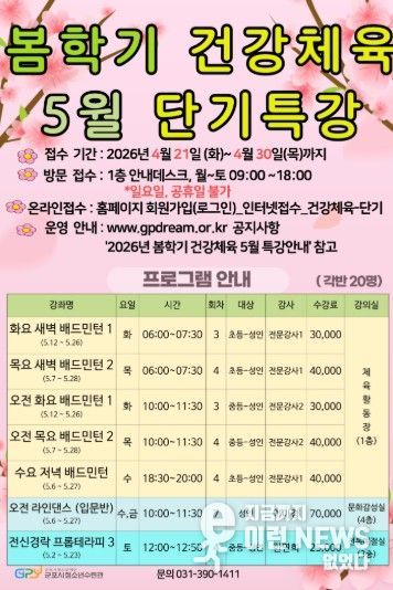 이번 건강체육 5월 단기특강은 청소년과 시민의 건강 증진 및 여가활동 활성화를 위해 마련됐으며, 배드민턴, 라인댄스, 프롭테라피 등 총 7개 강좌로 구성된다.
