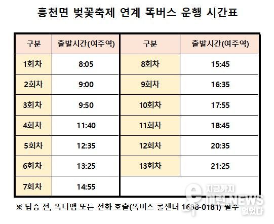 이충우 여주시장은 “흥천 남한강 벚꽃축제는 매년 수많은 인파가 몰리는 여주의 대표 축제인 만큼, 방문객들이 교통 불편 없이 축제를 즐길 수 있도록 특별 운행을 마련했다.”며, “특히 여주역에서 바로 연결되는 똑버스를 편리하게 이용해 즐거운 봄나들이 즐기시길 바란다”고 전했다.