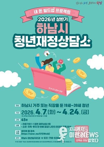 이런뉴스(e-runnews) 김삼성 기자 | 하남시는 청년들의 체계적인 자산관리를 지원하기 위해 ‘2026년 상반기 하남 청년재정상담소’ 1대 1 재무 상담 참여자를 오는 4월 24일까지 선착순 모집한다고 밝혔다.
