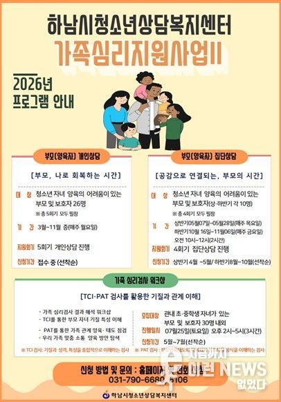 신청 대상은 하남시 관내 청소년(만 9세~24세) 자녀를 둔 부모(양육자) 및 가족이며, 자세한 내용과 신청 방법은 하남시청소년상담복지센터 홈페이지 또는 전화를 통해 안내받을 수 있다.