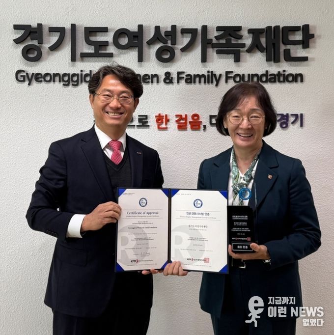 이런뉴스(e-runnews) 김삼성 기자 | 경기도여성가족재단은 한국경영인증원으로부터 인권경영시스템 인증(Human Rights Management System, HRMS)을 받아 7일 재단 회의실에서 수여식을 개최했다.