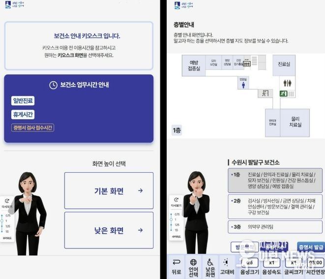 ▲수어 아바타를 통한 수어 번역 ▲화면 높낮이 조절 ▲시각장애인을 위한 고대비 화면 ▲영어·중국어 다국어 안내 ▲방문 목적·층별 안내 기능 등을 갖춰 보건소를 찾는 시민들이 더 쉽고 편리하게 서비스를 이용할 수 있도록 돕는다.