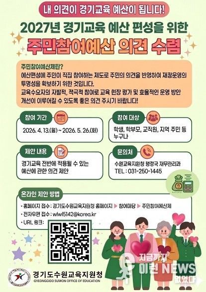 이런뉴스(e-runnews) 김삼성 기자 | 경기도수원교육지원청은 4월 13일부터 5월 26일까지 2027년도 경기교육 예산 편성을 위한 주민참여예산 의견수렴을 실시한다.