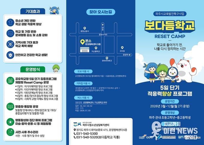 이런뉴스(e-runnews) 김삼성 기자 | 파주시가 심리·정서적 이유로 학업에 어려움을 겪는 학생들의 심리 안정과 건강한 학교생활 복귀를 돕기 위해 교육발전특구 시범사업인 ‘보다듬학교’를 본격적으로 운영하며, 핵심 프로그램인 ‘리셋캠프(Reset Camp)’참여자를 모집한다.