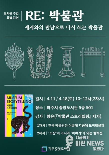 이런뉴스(e-runnews) 김삼성 기자 | 파주중앙도서관은 도서관 주간을 맞아 오는 4월 11일과 18일 토요일 10시, 특별 강연 ‘리(RE): 박물관-세계와의 만남으로 다시 쓰는 박물관’을 운영한다.