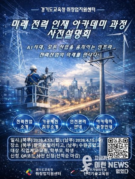 이런뉴스(e-runnews) 김삼성 기자 | 경기도교육청이 오는 13일과 15일 양일간 도내 직업계고 학생의 전력산업 분야 진로 탐색과 취업 역량 강화를 위한 ‘미래 전력 인재 아카데미 과정 사전설명회’를 개최한다.