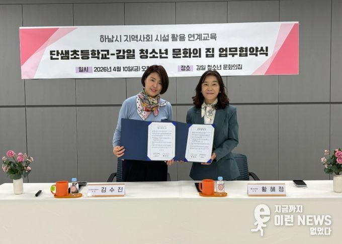 이런뉴스(e-runnews) 김삼성 기자 | 단샘초등학교는 4월 10일 감일 청소년 문화의 집과 학생 체험활동 확대 및 지역 연계 교육 강화를 위한 업무협약(MOU)을 체결했다고 밝혔다. 이번 협약은 학교와 지역사회 기관 간 협력을 통해 학생들에게 보다 다양한 교육 기회를 제공하고, 안전하고 의미 있는 체험 공간을 마련하기 위해 추진됐다.
