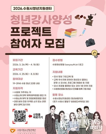 이런뉴스(e-runnews) 김삼성 기자 | 수원시청소년청년재단 수원시청년지원센터는 3월 26일부터 4월 18일까지 청년강사 양성을 위한 참여자 20여 명을 모집한다.