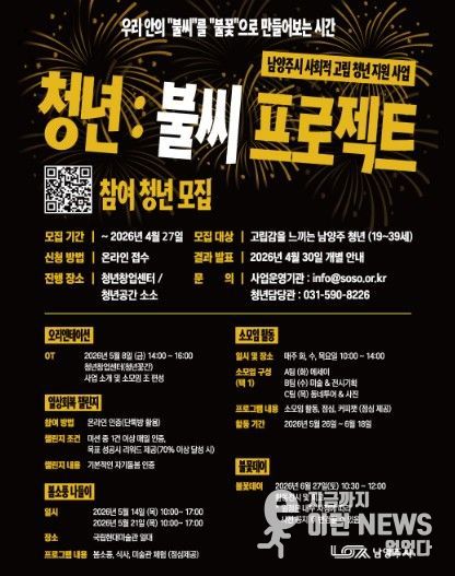 이런뉴스(e-runnews) 김삼성 기자 | 남양주시는 13일 사회적 고립 청년의 일상 회복과 관계 형성을 지원하는 ‘청년:불씨 프로젝트’ 참여자를 오는 27일까지 모집한다고 밝혔다.