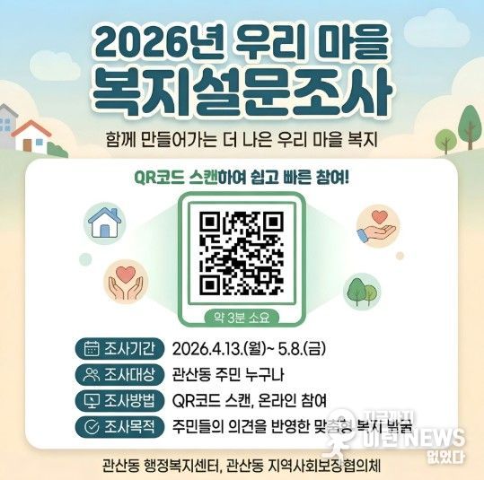 복지욕구조사는 관산동 주민을 대상으로 4월 13일부터 5월 8일까지 진행되며, 온라인 설문(QR코드) 또는 관산동 행정복지센터 방문을 통한 서면 참여 방식으로 누구나 쉽게 참여할 수 있다.