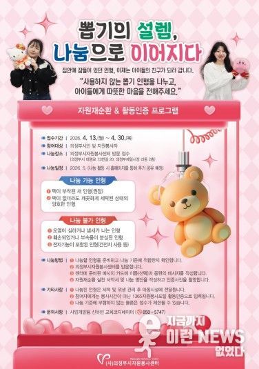 이런뉴스(e-runnews) 김삼성 기자 | 의정부시자원봉사센터는 4월 13일부터 4월 30일까지 자원재순환&활동인증 프로그램인“뽑기의 설렘, 나눔으로 이어지다”참여자를 모집한다.