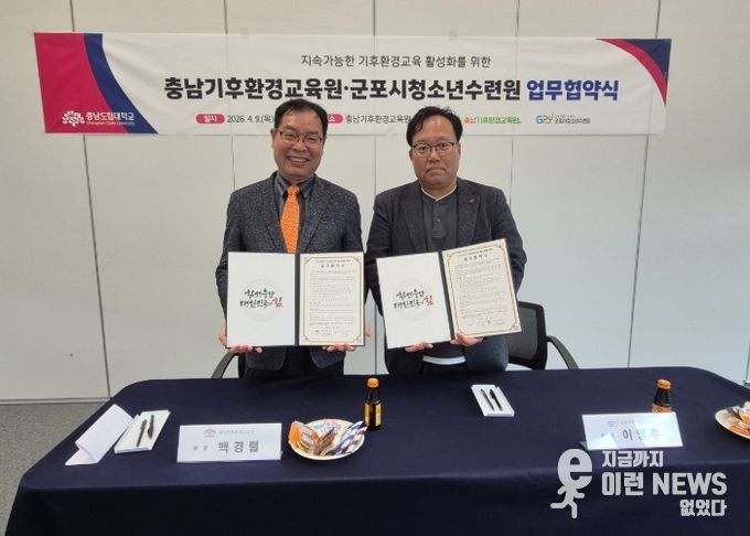 이런뉴스(e-runnews) 김삼성 기자 | (재)군포시청소년재단이 운영하는 군포시청소년수련원(충남 청양)과 충남기후환경교육원(충남 청양)은 4월 9일, 미래세대의 지속가능 기후환경교육 활성화를 위한 업무협약을 체결했다고 전했다.