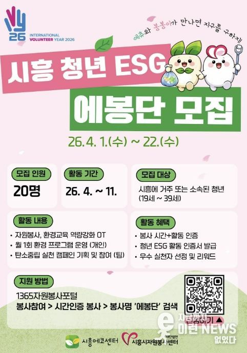 이런뉴스(e-runnews) 김삼성 기자 | 시흥시가 청년 주도의 환경 실천 확산과 ESG 가치 정착을 위해 ‘청년 ESG 에봉단’을 운영하는 가운데 1기 참여자 20명을 오는 4월 22일까지 모집한다.