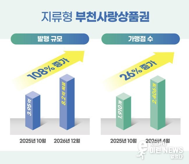 이런뉴스(e-runnews) 김삼성 기자 | 부천시가 지역경제 선순환을 위해 도입한 지류형 지역화폐 ‘부천사랑상품권’이 시행 반년 만에 발행 규모와 사용처가 모두 꾸준히 늘며 지역 상권에 활기를 더하고 있다.