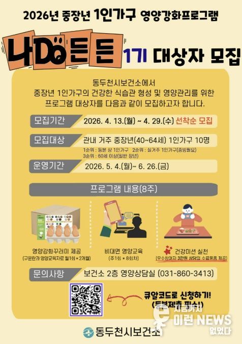 이런뉴스(e-runnews) 김삼성 기자 | 동두천시보건소는 중장년 1인 가구를 위한 맞춤형 영양강화 프로그램‘나DO든든’ 1기 참여자를 4월 13일부터 29일까지 모집한다고 밝혔다. 모집 인원은 선착순 10명이다.