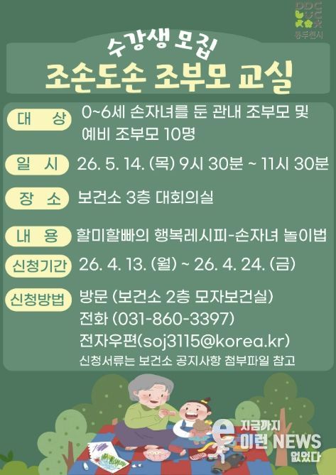 이번 ‘조손도손 조부모교실’은 오는 5월 14일 동두천시보건소에서 진행되며, 신청은 4월 13일부터 보건소에 등록된 임산부의 조부모를 대상으로 방문, 전화, 전자우편을 통해 선착순으로 받고 있다.