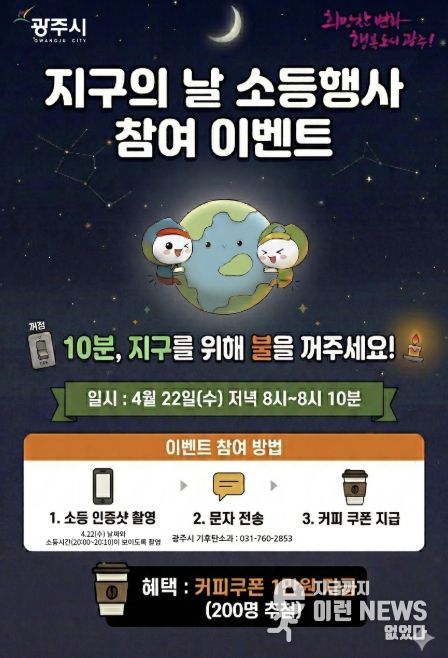 이런뉴스(e-runnews) 김삼성 기자 | 광주시는 제56주년 지구의 날(4월 22일)을 기념해 당일 10분간 진행하는 소등 행사와 연계한 시민참여 온라인 행사를 추진한다고 14일 밝혔다.