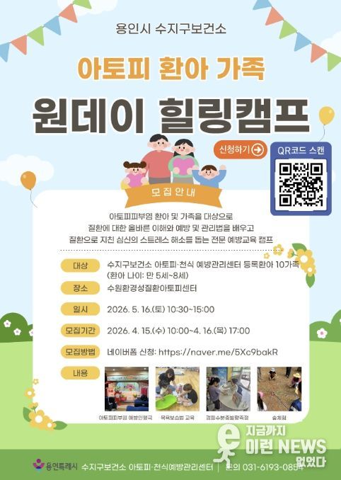 이런뉴스(e-runnews) 김삼성 기자 | 용인특례시 아토피·천식 예방관리센터는 아토피피부염 환아와 가족을 위한 ‘아토피 환아 가족 원데이 힐링캠프’ 참가자를 모집한다고 15일 밝혔다.
