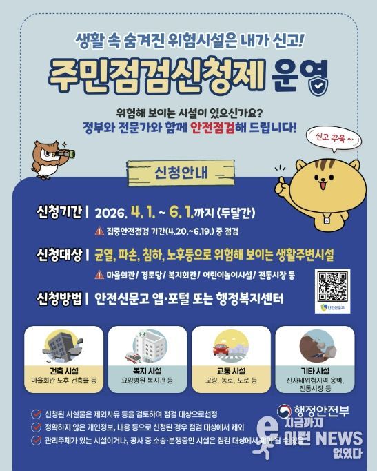주민점검신청제는 안전 관리 사각지대 해소를 목적으로 시민이 생활 속 위험요인을 직접 발굴해 안전점검을 신청하면, 전문가와 담당 공무원이 합동으로 현장을 점검하고 그 결과를 안내하는 제도다.