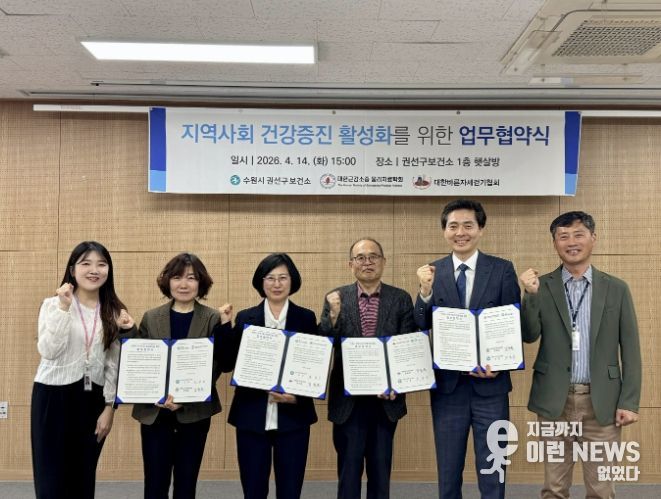 권선구보건소는 14일 보건소 1층 햇살방에서 대한바른자세걷기협회, 대한근감소증물리치료학회와 ‘지역사회 건강증진 활성화를 위한 업무협약’을 체결했다.