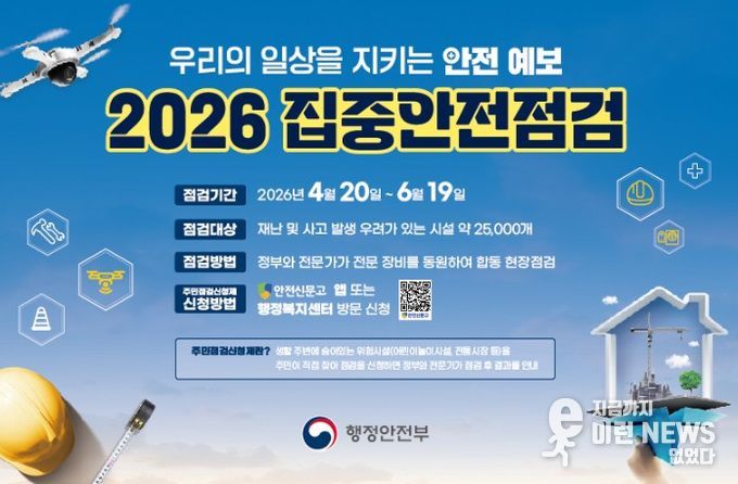 이와 함께 집중안전점검 기간 동안 시민이 직접 생활 주변 위험요인을 신고할 수 있도록 안전신문고 홍보를 강화하고, 주민이 점검을 신청하는 ‘주민점검신청제’를 활성화해 시민 참여 기반의 안전관리도 확대할 방침이다.