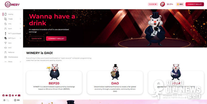 디센트플래닛에 따르면 와이너리스왑(winery.finance)는 바이낸스 스마트체인(BNB)을 기반으로 가상화폐간의 거래를 지원한다. 덱스를 통해 유동성 공급을 하거나 가상자산을 예치해이윤을 낼 수 있으며, 신규 덱스 프로젝트를 사전참여 할 수 있는 IDO를 제공하고 자체 NFT마켓 플레이스에서 민팅 및 거래를 할 수 있다.