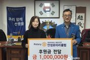 이런뉴스(e-runnews) 김삼성 기자 | 안성시동부무한돌봄네트워크팀은 지난 26일 국제로타리 3600지구 안성로타리클럽으로부터 촘촘한 복지 안전망 구축을 위한 후원금 100만 원을 전달받았다. 안성로타리클럽은 매년 지역사회를 위한 봉사와 나눔을 실천하며 지역 발전에 기여해 왔으며, 이번 후원금은 복지 사각지대 발굴과 사례관리 대상자에게 전문적인 복지 서비스를 제공하는 데 사용될 예정이다. 안성로타리클럽 이승재 회장은 “현장에서 발로 뛰며 소외된 이웃을 찾는 안성시동부무한돌봄네트워크팀의 활동에 실질적인 도움이 되길 바란다”며 “앞으로도 지역사회의 다양한 사회공헌 프로젝트를 통해 지역 복지 서비스의 질을 높이는 마중물이 되겠다”고 말했다. 안성시동부무한돌봄네트워크팀 정은주 센터장은 “복지 사업을 더욱 안정적이고 원활하게 추진할 수 있도록 도움을 주신 안성로타리클럽에 깊이 감사드린다”며 “지역 주민에게 필요한 맞춤형 복지 서비스를 제공하는 데 최선을 다하겠다”고 말했다