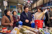 이런뉴스(e-runnews) 김삼성 기자 | 이재명 대통령과 김혜경 여사는 오늘 낮, 설 명절을 앞두고 충북 충주시에 위치한 무학시장을 찾아 지역 세밑 물가를 점검하고 상인들을 만나 현장 의견을 청취했다. 무학시장은 지난 1978년 노점상들의 정착을 위해 개설된 전통시장이며, 이번 방문은 설 민심을 청취하기 위한 민생 행보의 일환이다. 이 대통령과 김 여사는 시장 내 여러 상점을 들러 “새해 복 많이 받으세요”라며 인사를 했고, 상인과 시민들은 환호와 박수로 이 대통령 부부를 맞았다. 이 대통령 부부에게 더덕을 판매한 상인은 “덕분에 마수걸이를 한다”며 “오늘 장사가 잘될 것 같다”고 말해 웃음을 자아냈다. 다른 상인들도 “힘나게 해주셔서 감사하다”, “너무 고생 많으시다”며 인사를 전했다. 이 대통령 부부는 황태포, 시금치, 곶감과 깐밤 등 제수용품과 먹거리를 구입했고 백도라지, 마른 멸치, 배추전 등을 즉석에서 맛보기도 했다. 이 대통령 부부는 온누리상품권과 현금으로 결제했다. 김 여사가 물건을 고르는 사이 이 대통령은 상인들에게 “장사는 잘 되느냐”, “곧 설인데 어떠시냐”고 물었