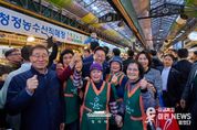 이런뉴스(e-runnews) 김삼성 기자 | 이재명 대통령은 30일 오후 제주 타운홀미팅 '제주의 마음을 듣다' 종료 후, 김혜경 여사와 함께 1박 2일 제주 일정의 마지막 일정으로 동문시장을 방문했다. 동문시장은 제주시 도심에 위치한 대표적인 전통시장으로, 대통령 부부의 방문 소식에 상인들과 방문객들은 놀라움 속에 환호와 박수로 이들을 맞이했다. 입구에 서 있던 한 외국인 관광객은 어디서 왔냐는 이 대통령의 질문에 “오스트레일리아”고 답하기도 했다. 이 대통령 부부는 셀카촬영과 악수를 이어가며 과일모찌 가게에 들러 온누리상품권으로 한라봉모찌와 딸기모찌를 구입해 즉석에서 강유정 대변인, 하정우 수석 등과 함께 시식했다. 이동 내내 이어지는 셀카요청에도 이 대통령 부부는 반갑게 응했다. 그러자 시장을 찾은 많은 도민들은 이동 중인 이 대통령 부부를 향해 "사랑해요", "와 대박", "화이팅"을 외치는 소리로 화답했다. 이 대통령은 특히 어린이들의 사진 요청에 적극적으로 답했다. "애기 있어요"라는 소리가 들리면 발걸음을 멈추고 아이들과 하이파이브를 하거나 반갑게 셀카를 찍었다.
