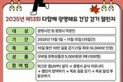 이런뉴스(e-runnews) 김삼성 기자 | 광명시는 시민들의 건강한 생활습관 형성과 걷기 문화 확산을 위해 ‘제13회 다함께 광명해요 건강 걷기 챌린지’를 진행한다. 이번 챌린지는 오는 11월 1일부터 15일까지 15일간 열리며, 광명시민과 광명시에 소재한 직장인이면 누구나 참여할 수 있다. 참가자는 기간 동안 총 10만 보를 걸으면 되며, 1일 최대 1만 보까지만 인정된다. 참여 방법은 간단하다. 10월 29일부터 워크온(WalkOn) 앱을 설치하고 광명시 공식 커뮤니티에 가입한 뒤 ‘제13회 건강 걷기 챌린지 참여하기’를 눌러 걷기를 시작하면 된다. 단, 목표 걸음을 달성한 시민은 ‘응모하기’ 버튼을 눌러 참여를 완료하면 된다. 누적 걸음 수 목표를 달성한 참여자 중 추첨으로 100명에게 모바일 문화상품권 5천 원권 1매를 지급한다. 당첨자 발표와 상품 지급은 11월 17일부터 11월 21일까지 진행할 예정이다. 나기효 건강위생과장은 “매회 많은 시민이 참여하는 ‘다함께 광명해요 건강 걷기 챌린지’는 일상 속 건강한 습관을 형성할 좋은 기회다”며 “시민들이 걷기를 통해 건강도 챙기