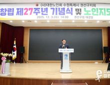 이런뉴스(e-runnews) 김삼성 기자 | 수원특례시의회는 3일 권선구청 대회의실에서 열린‘대한노인회 수원시 권선지구 제27주년 기념식 및 노인지도자대회’에 참석해 어르신 지도자들의 노고를 축하하고 격려했다. 이번 행사는 이재식 의장을 비롯한 이찬용 도시미래위원장, 윤경선 인사청문특별위원장, 유재광 의원, 대한노인회 지회 관계자, 경로당 회장 등이 함께했으며 축하공연을 시작으로 노인강령 낭독, 연혁보고, 시상, 노인지도자 노래자랑 등이 이어졌다. 이재식 의장은 “경로당은 어르신들께서 즐겁게 하루를 보내실 수 있도록, 일상을 든든하게 지켜주는 소중한 공간”이라며 “수원특례시의회는 경로당을 중심으로 어르신들께서 더욱 활력 넘치는 노후를 보내실 수 있도록 경로당 복지 강화를 위해 앞으로도 최선을 다하겠다”고 말했다.