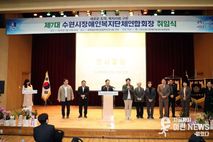 이런뉴스(e-runnews) 김삼성 기자 | 수원특례시의회는 2월 27일 호매실장애인종합복지관에서 열린 '수원시장애인복지단체연합회 제7대 회장 취임식'에 참석해 새로운 출발을 축하했다. 이날 행사에는 보건복지위원회 이희승 위원장(더불어민주당, 영통2·3·망포1·2), 인사청문특별위원회 윤경선 위원장(진보당, 평·금곡·호매실), 박현수 국민의힘 교섭단체대표(국민의힘, 평·금곡·호매실)를 비롯해 유재광 의원(국민의힘, 율천·서둔·구운·입북), 정영모 의원(국민의힘, 영화·조원1·연무), 사정희 의원(더불어민주당, 매탄1·2·3·4), 김경례 의원(더불어민주당, 비례대표), 홍종철 의원(국민의힘, 광교1·2), 이대선 의원(더불어민주당, 율천·서둔·구운·입북)도 함께했으며, 장애인단체 관계자와 내·외빈 200여 명이 참석한 가운데 내빈 축사와 축하공연, 기념촬영 등이 진행됐다 제7대 회장으로 취임한 이종갑 회장은 앞으로 3년간 연합회를 이끌며 장애인단체 간 협력과 권익 증진 활동을 추진할 예정이다. 수원시장애인복지단체연합회는 지역 내 장애인 단체들이 참여하는 협의체로, 복지 정책 건의와 현장 의견 전달 창구 역할을 맡고 있다.