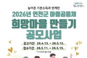 이런뉴스(e-runnews) 김삼성 기자 | 연천군 마을공동체지원센터가 농어촌기본소득과 연계한 ‘2026년 희망마을 만들기 주민공모사업’ 참여 공동체를 모집한다. ‘희망마을 만들기 공모사업’은 지역의 인적·물적 자원을 활용해 주민 스스로 마을의 문제점을 발굴하고 해결 방안을 모색해 실행할 수 있는 마을 단위의 주민 주도형 공동체 활동 지원사업으로, 총 10개 공동체를 선정해 팀당 최대 200만 원을 지원할 계획이다. 올해 희망마을 만들기 공모사업은 5월 중 1차 서류심사 및 2차 발표심사를 거쳐 6월 최종 선정되며, 기존과는 다르게 이음메이커(공동체지원활동가)를 공동체와 연계해 현장 밀착형 지원을 강화한다. 이음메이커는 사업 추진 과정에서 공동체가 어려움을 겪는 정산 업무와 운영 방향 설정을 함께 고민하고, 실질적인 활동 역량을 높일 수 있도록 맞춤형 지원을 제공할 예정이다. 신청 대상은 농어촌기본소득을 수급하는 5인 이상의 주민 모임이며, 환경·생태, 돌봄·나눔, 마을 경제, 마을 기록 등 다양한 분야의 활동이 가능하다. 특히 단순 행사나 일회성 사업은 제외하고, 지속가능성과 공익성을