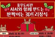 이런뉴스(e-runnews) 김삼성 기자 | 김포시 풍무도서관에서 초등학생을 대상으로 ‘사서와 함께 만드는 반짝이는 3D트리장식’을 오는 12월 10일 오후 4시부터 6시까지 운영한다. 이번 프로그램은 수강생의 학년에 따라 제작 도구의 난이도와 창작물이 구분되며, 참여 학생의 수준에 맞춘 맞춤형 체험활동으로 운영된다. 3D펜을 활용한 제작 경험을 통해 공간·입체 감각을 향상시키는 동시에 연말 크리스마스 시즌의 특색있는 분위기를 느낄 수 있다. 특히 풍무도서관 특화담당 사서가 직접 프로그램을 진행함으로써 안전하고 체계적인 지도가 이뤄질 것이다. 참여 신청은 11월 25일 오전 10시부터 풍무도서관 홈페이지에서 가능하며, 초등학생(1~6학년) 총 12명을 선착순 모집한다.