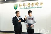 이런뉴스(e-runnews) 김삼성 기자 | 김동연 경기도지사가 16일 동두천중학교를 찾아 노점 할머니께 비상금을 건넨 선행으로 화제가 된 옥현일 군에게 표창을 수여했다. 김 지사는 학교 현관에서 학생회와 함께 ‘함께라서 더 빛나는 우리’ 생명존중 캠페인에 동참하고, 이어 1층 로비에서 옥현일 군에게 표창장을 전달했다. 옥현일 군은 지난 7월 폭염 속에서 노점상 할머니에게 비상금 3만 원을 건네고 콩 한 봉지를 받은 사연이 알려지며 주목받았다. SNS에 게시된 영상은 인근 공방 운영자가 촬영한 것으로, 현일 군이 남모르게 베푼 선행이 담겨 3일 만에 206만 조회수, ‘좋아요’ 약 7만, 댓글 2,500개 이상을 기록했다. 당시 현일 군은 “더운 날씨에 할머니가 물건을 빨리 팔고 쉬셨으면 좋겠다는 마음이었다”고 말해 많은 시민에게 감동을 줬다. 김동연 지사는 이날 인사말을 통해 “옥현일 군이 도운 할머니가 우리의 어머니, 할머니”라며 “수많은 옥현일 군이 동두천중에 있다고 본다. 그것이 사람 사는 세상”이라고 말했다. 이어 “여러분이 그런 따뜻한 마음을 갖길 바란다. 당장은 남을 위한