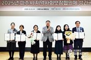 이런뉴스(e-runnews) 김삼성 기자 | 파주시는 지난 3일, ‘지혜의 숲’대회의실에서 '2025년 지역사회보장협의체 성과공유회’를 개최했다. 이번 행사에는 대표협의체, 실무협의체, 분과위원, 읍면동 협의체 위원 등 150여 명이 참석했으며, 공공위원장 김경일 시장과 민간위원장 이보경 위원장이 공동으로 주관했다. 올해 성과공유회는 ‘함께라서 빛났던 2025년, 반짝이며 나아갈 2026년’을 주제로, 한 해 동안 지역 복지를 위해 헌신한 협의체 활동을 돌아보고, 현장의 성과를 확산하기 위한 취지로 마련됐다. 행사 전 참여자들이 작성한 붙임쪽지는 행사장 앞 성탄절 나무에 장식되어, 각자의 바람과 격려가 하나의 공동체적 상징으로 모아졌다. 성탄절 나무 쪽지 걸기 시연회는 올 한 해 서로 간에 다져온 협력의 의미를 되새기고, 다가오는 2026년을 향한 희망을 함께 공유하는 시간으로 이어졌다. 1부 행사에서는 협의체 위원 소개와 함께 유공자 24명 및 특화사업 우수 읍면동 3개소에 대한 표창이 진행됐으며, 공동위원장 두 명의 기념사를 통해 한 해의 활동을 마무리하는 알림말(메시지)이 전해졌다. 이어 활동